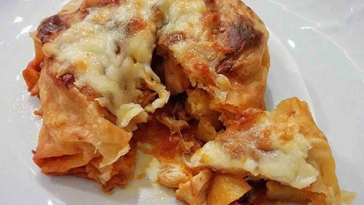 Malzemeler: 1 adet yufka, 650 gram kuşbaşı tavuk eti1 çay bardağı haşlanmış bezelye, 1 adet orta boy patlıcan, 1 yemek kaşığı biber salçası, 1 adet soğan, 1/2 yemek kaşığı tereyağı, 1 yemek kaşığı zeytinyağı, tuz, karabiber, hazır beşamel sos.