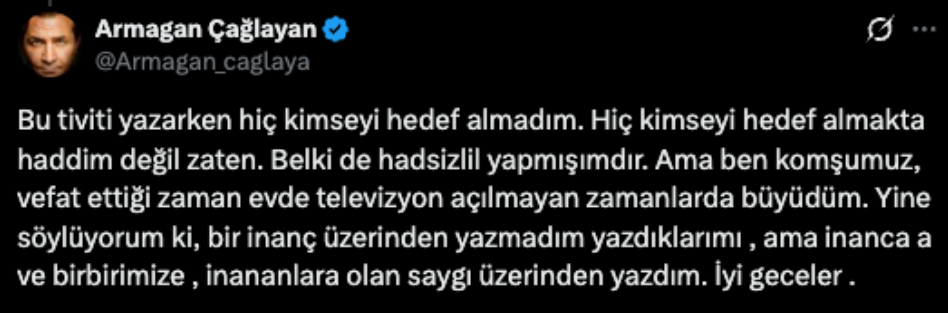 Tartışmalara neden olan paylaşımın ardından yeni bir açıklama yapan Çağlayan, "Bu tiviti yazarken hiç kimseyi hedef almadım. Hiç kimseyi hedef almakta haddim değil zaten. Belki de hadsizlil yapmışımdır. Ama ben komşumuz, vefat ettiği zaman evde televizyon açılmayan zamanlarda büyüdüm. Yine söylüyorum ki, bir inanç üzerinden yazmadım yazdıklarımı , ama inanca a ve birbirimize, inananlara olan saygı üzerinden yazdım. İyi geceler" ifadelerini kullandı.