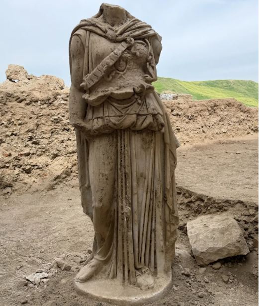 Laodikeia Antik Kenti’nde yürütülen kazı ve restorasyon çalışmaları kapsamında, Batı Tiyatrosu sahne binasında 2 metre uzunluğunda beyaz mermer Athena heykeli gün yüzüne çıkarıldı.