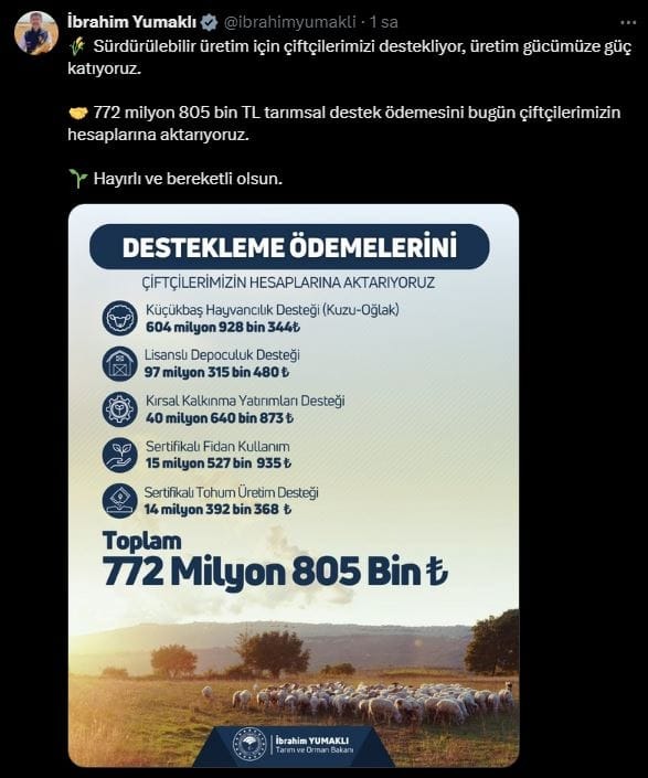 Tarım ve Orman Bakanı İbrahim Yumaklı sosyal medya hesabından yaptığı açıklama ile destekleme ödemelerinin çiftçilerin hesaplarına yatırılmaya başlandığını duyurdu.