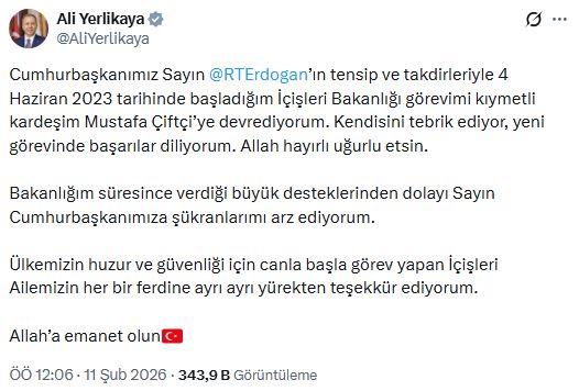 Ali Yerlikaya, sosyal medya hesabından yaptığı paylaşımda, "Cumhurbaşkanımız Sayın Recep Tayyip Erdoğan’ın tensip ve takdirleriyle 4 Haziran 2023 tarihinde başladığım İçişleri Bakanlığı görevimi kıymetli kardeşim Mustafa Çiftçi’ye devrediyorum. Kendisini tebrik ediyor, yeni görevinde başarılar diliyorum. Allah hayırlı uğurlu etsin. Bakanlığım süresince verdiği büyük desteklerinden dolayı Sayın Cumhurbaşkanımıza şükranlarımı arz ediyorum. Ülkemizin huzur ve güvenliği için canla başla görev yapan İçişleri Ailemizin her bir ferdine ayrı ayrı yürekten teşekkür ediyorum. Allah’a emanet olun" dedi.