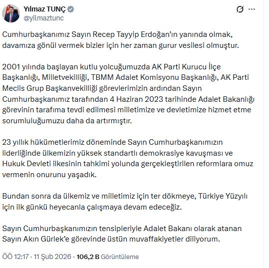 Görevden alınan Adalet Bakanı Yılmaz Tunç da sosyal meday hesabından veda mesajı paylaştı. Tunç'un paylaşımı şöyle: