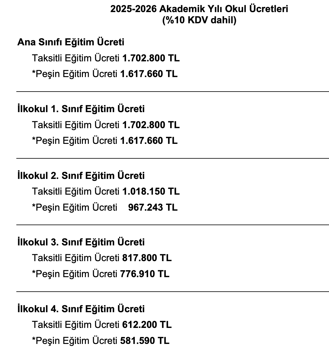 Okul yeni dönem için anaokulu ve ilkokul 1. Sınıf fiyatlarını 1 milyon 702 bin 800 TL olarak belirlerken, ortaokul 1 milyon 470 bin 600 TL, lise ise 1 milyon 625 bin 400 TL olarak belirlendi.
