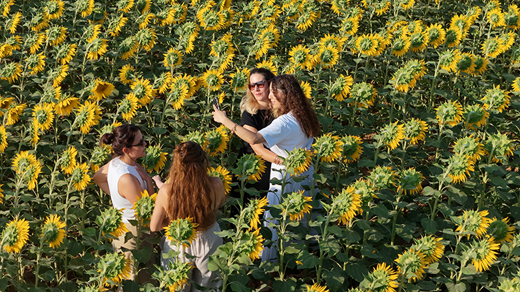 Sarı ve yeşilin tonlarıyla görsel şölen oluşturan ayçiçekleri, özellikle gün doğumu ve gün batımında kartpostallık manzaralar oluşturuyor.