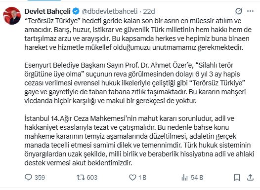MHP Genel Başkanı Devlet Bahçeli, Esenyurt Belediye Başkanı Ahmet Özer’e “silahlı terör örgütüne üye olma” suçundan verilen 6 yıl 3 ay hapis cezasının evrensel hukuk ilkeleriyle ve “Terörsüz Türkiye” hedefiyle çeliştiğini belirterek kararın temyizde düzeltilmesi gerektiğini söyledi.