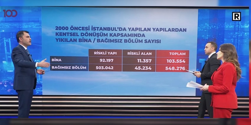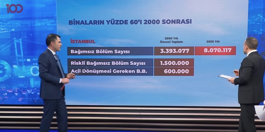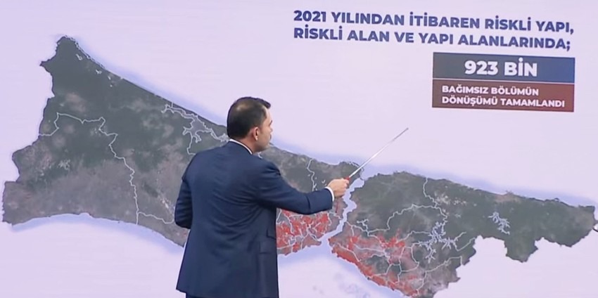 Yapılan değerlendirmelerde 1.5 milyon riskli bağımsız bölüm sayısı olduğunu görüyoruz. 600 bini de acil dönüşmesi gerekiyor. Bizim İstanbul'u kurtarma planımız bu. Burada sevindirici olan kısım ise yüzde 60'ı yeni bina.