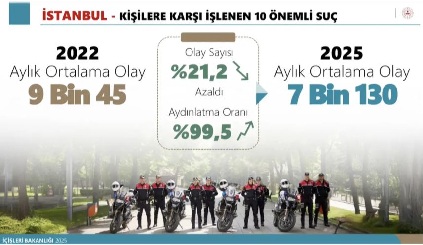 İstanbul'da kişilere karşı işlenen 10 önemli katalog suçunda 2022 yılındaki aylık ortalama olay sayısı 9 bin 45 idi. Bu sayı 2025 yılında aylık bazda 7 bin 130'a geriledi.