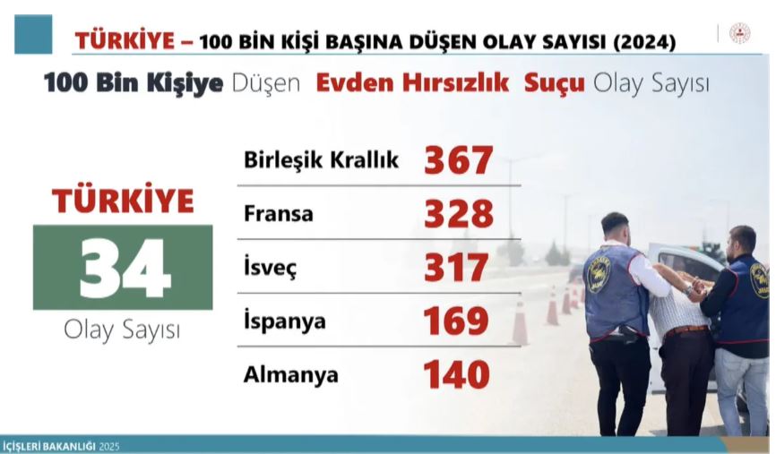 "2023 yılında yüz bin kişiye düşen evden hırsızlık olay sayısı ülkemiz genelinde 66 idi. 2024 yılında bu rakam 34'e, 2025 ilk 11 ayında 19,9'a düştü. 2024 yılında evden hırsızlı olayı ülkemizde 34 iken, bu rakam Birleşik Krallıkta 367 yani ülkemizden 11 kat daha fazla. Fransa 328, İsveç 317, İspanya 169, Almanya'da 140. 2024 yılında yüz bin kişiye düşen dolandırıcılık suçu olay sayısı Türkiye'de 125 iken, bu rakam İsveç'te 2 bin 19, Almanya'da 879, Norveç'te 528, İspanya'da 218. 2024 yılında yüz bin kişiye düşen yağma ve gasp olayları sayısı Türkiye'de 14, İspanya'da 131, Birleşik Krallık 117, İsveç'te 83, Almanya'da 17. 20024 yılında yüz bin kişiye düşen cinsel saldırı olay sayısı Türkiye'de 10, Norveç'te 130, İspanya'da 40, Almanya'da 16. Yüz bin kişiye düşen kasten öldürme suçu olay sayısı Türkiye'de 2,3. Bu rakam İsveç'te 4.7, İspanya'da 4,3.