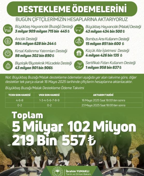 Paylaşımda yer alan bilgilere göre, büyükbaş hayvancılık (buzağı) desteği 3 milyar 909 milyon 715 bin 445 lira, büyükbaş hayvancılık (malak) desteği 43 milyon 434 bin 500 lira, arıcılık desteği 984 milyon 628 bin 244 lira, bombus arısı kullanım desteği 15 milyon 851 bin 600 lira, kırsal kalkınma yatırımları desteği 98 milyon 302 bin 890 lira, küçük aile işletmesi desteği 4 milyon 426 bin 135 lira, biyolojik/biyoteknik mücadele desteği 43 milyon 901 bin 906 lira, sertifika fidan kullanım desteği 1 milyon 958 bin 837 lira olarak belirlendi.
