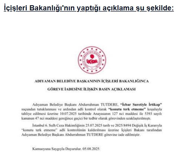 İçişleri Bakanlığı tarafından yapılan açıklamaya göre, Adıyaman Belediye Başkanı Abdurrahman Tutdere görevine iade edildi.