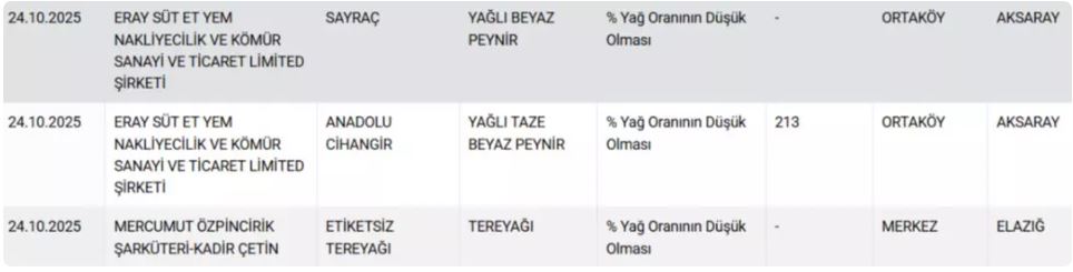 Güncellenen listede süt ürünleri dikkat çekti. Peynir, tereyağı ve yoğurt gibi ürünlerde hile yapan markalar tespit edildi.