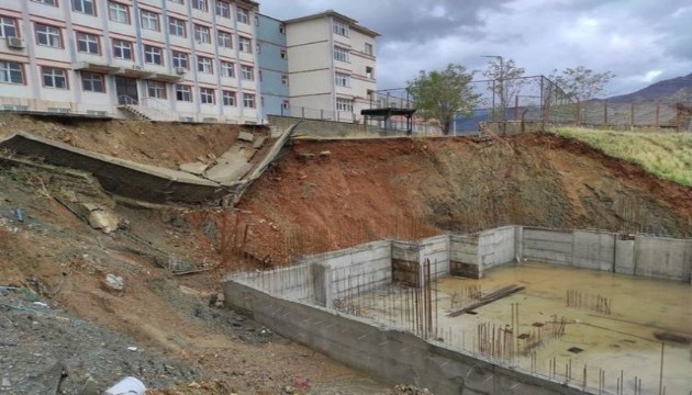 Daha önce okul bitişinde yapılan inşaat kazısı nedeniyle altı boşaltılan Sason Anadolu Lisesi'ne ait istinat duvarı, gece etkili olan yağışların ardından inşaat alanına kaydı.