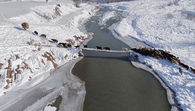Doğada karşılaştıkları zorlukların yanı sıra kar, tipi ve dondurucu soğuklara karşı mücadele eden besiciler, hayvanlarını yem istifledikleri ahırlara götürmek için yine Peri Suyu'ndaki tahta köprüden geçiriyor.
