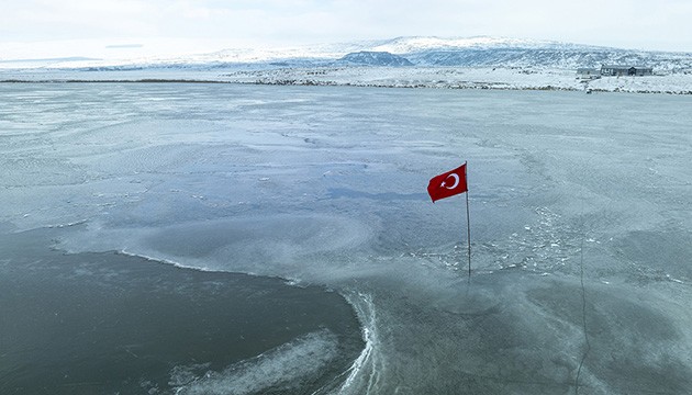 Doğu Anadolu Bölgesi'nde Van Gölü'nden sonra ikinci büyük göl olan Çıldır Gölü yüzeyinin bir bölümü, soğuk havanın etkisiyle dondu.