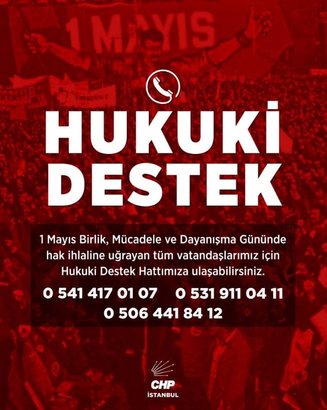 İstanbul'daki 1 Mayıs etkinliklerinin gün boyunca Hukuk Komisyonu'yla takip edeceklerini belirten Çelik, sosyal medya hesabından, olası hak ihlallerine karşı hukuki destek numaraları paylaştı.
