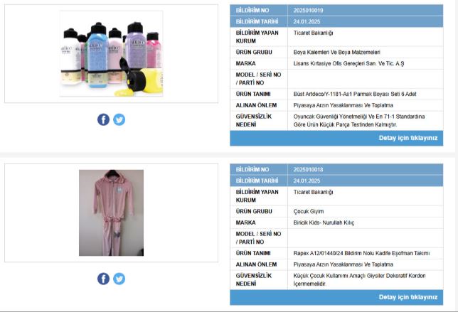 Bakanlık 2 ürünün daha piyasadan toplatılmasına karar verdi. "Biricik Kids" markasına ait çocuk eşofman takımı ve "Lisans Kırtasiye Ofis Gereçleri" markalı boya kalemleri ve boya malzemeleri ürünü yasaklandı.