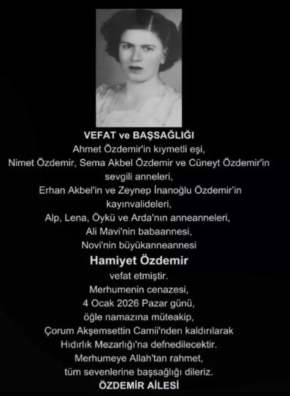 Hamiyet Özdemir’in cenazesi, 4 Ocak 2026 Pazar günü öğle namazına müteakip Çorum Akşemsettin Camii’nden kaldırılarak Hıdırlık Mezarlığı’nda toprağa verilecek.