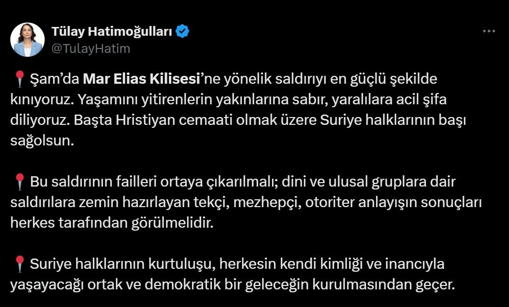 "Şam’da Mar Elias Kilisesi’ne yönelik saldırıyı en güçlü şekilde kınıyoruz. Yaşamını yitirenlerin yakınlarına sabır, yaralılara acil şifa diliyoruz. Başta Hristiyan cemaati olmak üzere Suriye halklarının başı sağolsun.