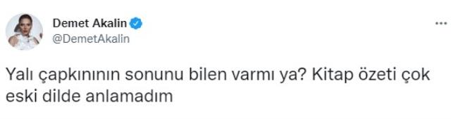 Akalın, başrollerinde Afra Saraçoğlu, Mert Ramazan Demir, Çetin Tekindor, Şerif Sezer , Emre Altuğ ve Gözde Kansu'nun oynadığı dizinin sonunu merak etti. Ünlü şarkıcı, "Yalı Çapkını'nın sonunu bilen var mı ya? Kitap özeti çok eski dilde anlamadım" sorusunu Twitter hesabından paylaştı.