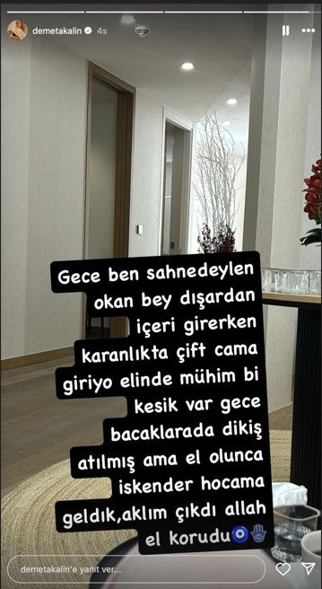 "Gece ben sahnedeyken Okan Bey dışarıdan içeri girerken karanlıkta çift cama giriyor. Elinde mühim bir kesik var. Gece bacaklara da dikiş atılmış. Aklım çıktı, Allah korudu."