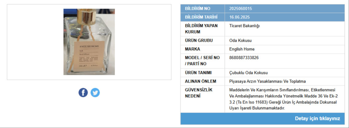 "English Home" marka çubuklu oda kokusunun piyasaya arzı yasaklandı ve ürünlerin toplatılmasına karar verildi.