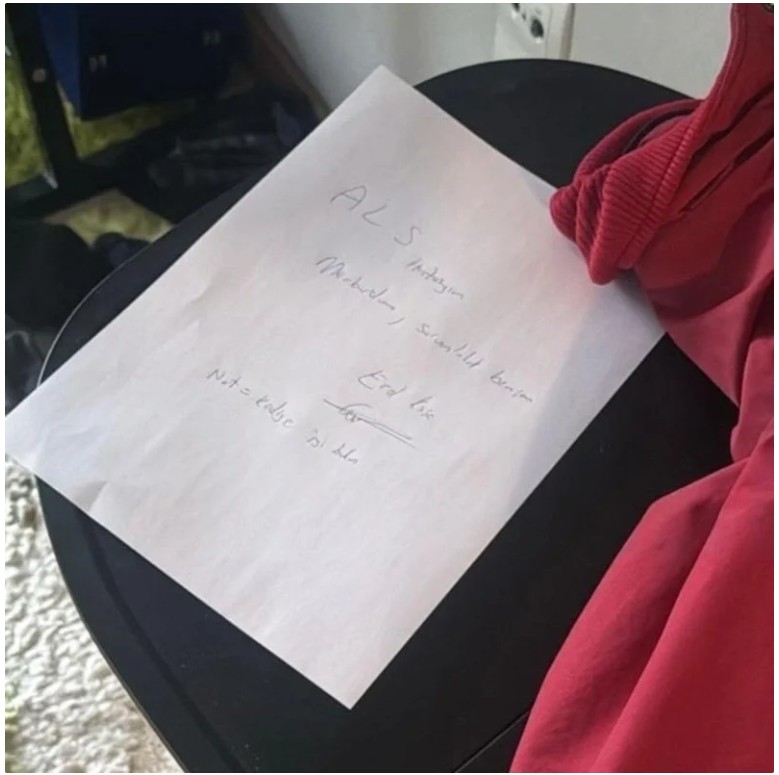 Söz konusu notta, "ALS hastalığımdan dolayı mecburdum, sorumluluk benim. Kediye iyi bakın" yazdığı öğrenildi.