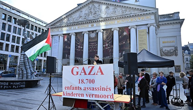 Brüksel'deki Kraliyet Tiyatrosu önünde bir araya gelen sanatçılar, "Gazze çocuklarının sessizliği" adını verdikleri gösteride 18 bin 700 çocuğun İsrail tarafından öldürüldüğünü belirtti.