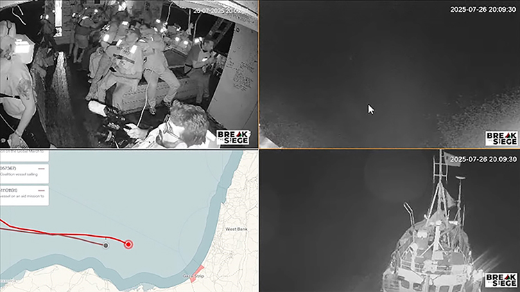 Özgürlük Filosu Koalisyonu WhatsApp kanalından yapılan açıklamada, 26 Temmuz'un son saatinde gemiye uluslararası sularda müdahale edildiği ve İsrail askerlerinin güvenlik kameralarını indirdiği belirtilmişti.