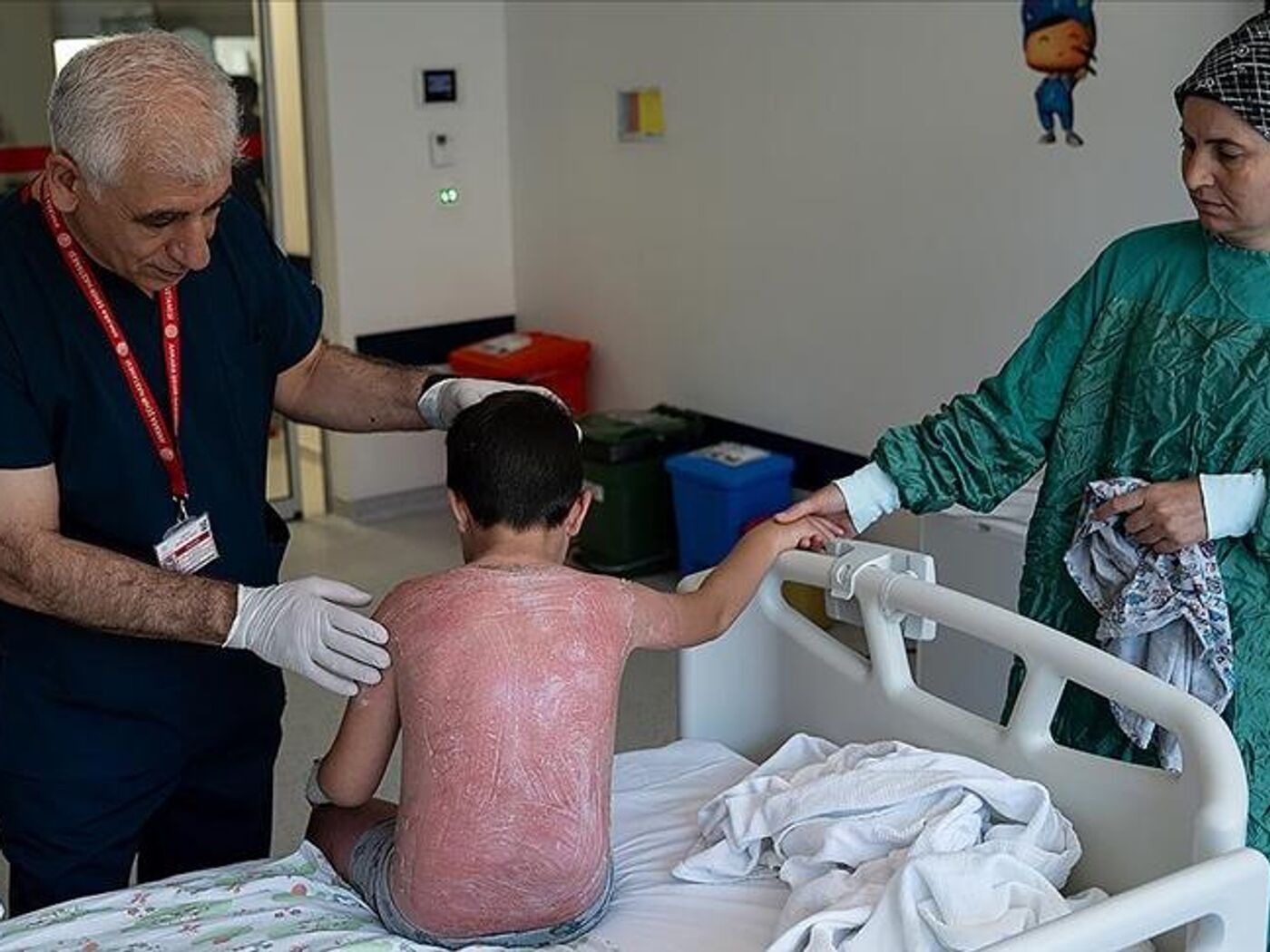 "Bu çocuğumuz yaklaşık 4 saat güneşte kalmış. O anda ağrıyı hissetmeyebiliyor. Bunu ailelerin sağlaması, belli aralıklarla uyarmaları lazım. Güneşten koruyucu yüksek faktörlü krem kullanmaları lazım. Her şeye rağmen böyle bir yanık meydana geldiyse mutlaka bir sağlık merkezine götürmeleri lazım. Götürmeden önce de bir çeşme suyunda soğutmaları ve arkasından da nemlendirici kremler evde ne varsa öneriyoruz. Aynı zamanda yaşına göre ağrı kesici bir şurup vermelerini öneriyoruz."