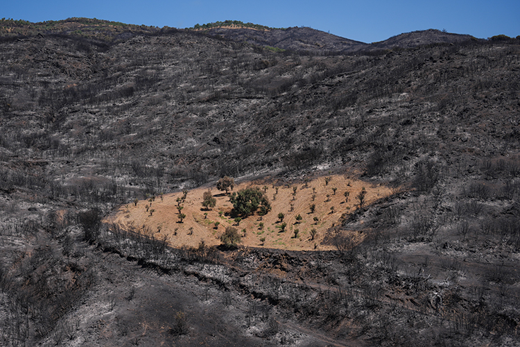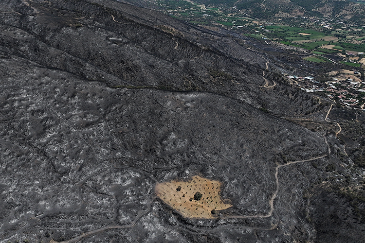 İzmir'in Ödemiş ilçesinde çıkan orman yangınında, çiftçi Ahmet Türk'ün daha önceden sürüp otlardan temizlediği bahçe, siyah örtüyle kaplanan bölgede yanmamış olmasıyla dikkati çekiyor.