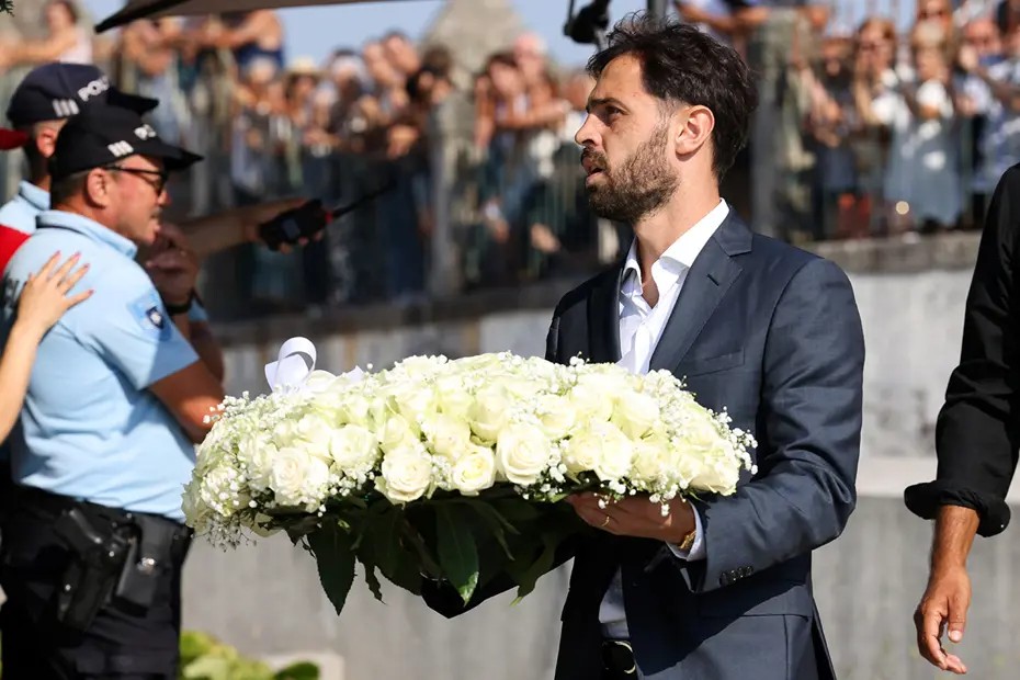 Bernardo Silva elinde bir çiçekle gelirken, Liverpool'un Hollandalı futbolcusu Virgil van Dijk ise Jota'nın 20 numaralı forması şeklinde bir çelenk taşıdı.