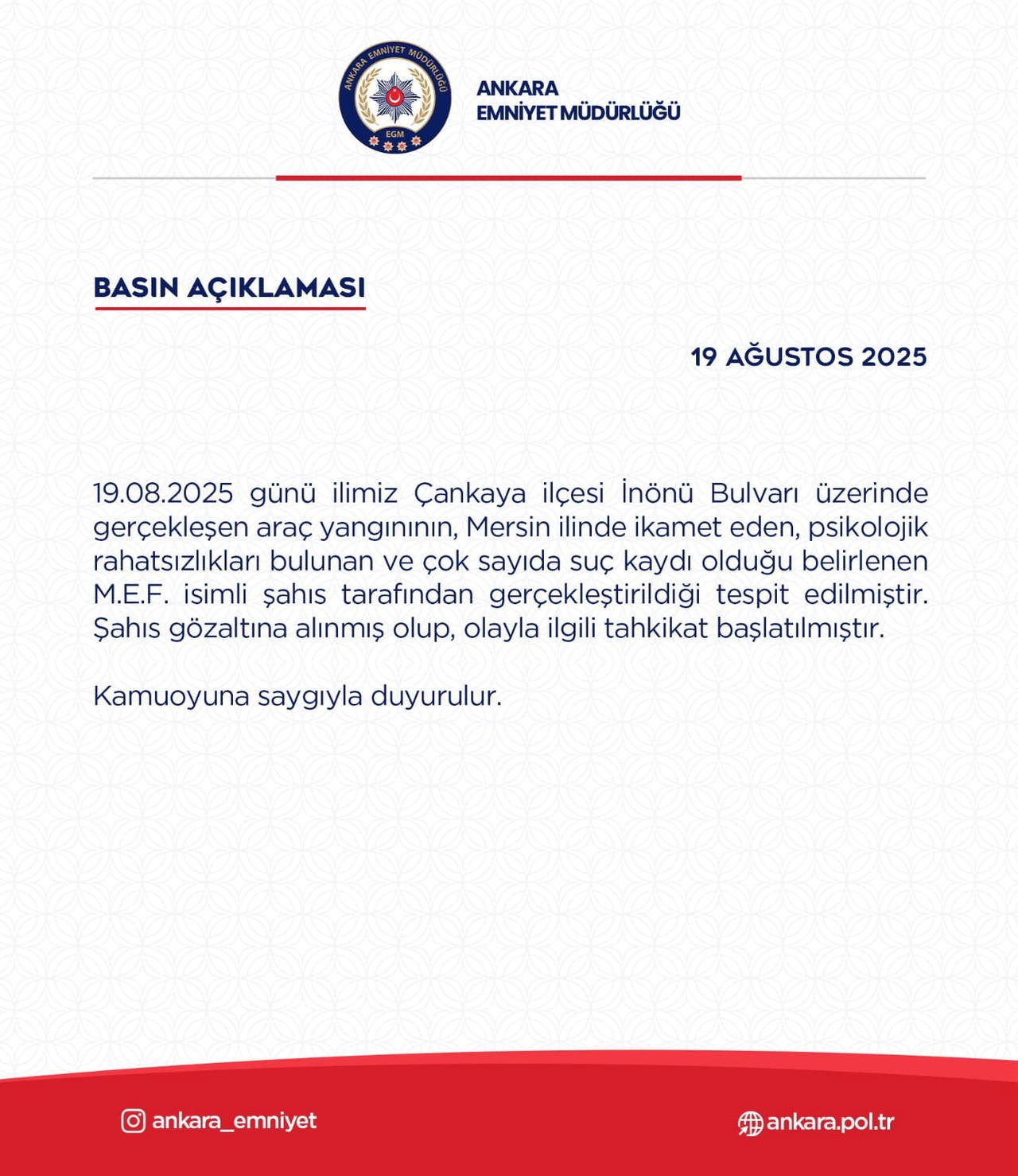 "19.08.2025 günü ilimiz Çankaya ilçesi İnönü Bulvarı üzerinde gerçekleşen araç yangınının, Mersin ilinde ikamet eden, psikolojik rahatsızlıkları bulunan ve çok sayıda suç kaydı olduğu belirlenen M.E.F. isimli şahıs tarafından gerçekleştirildiği tespit edildi. Şahıs gözaltına alınmış olup, olayla ilgili tahkikat başlatılmıştır."
