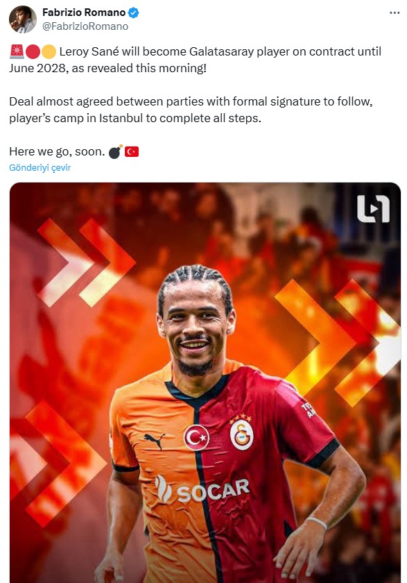 Transfer haberleriyle ünlü isim Fabrizio Romano da X hesabından yaptığı paylaşımda Galatasaray'ın Sane ile anlaştığını yazdı.