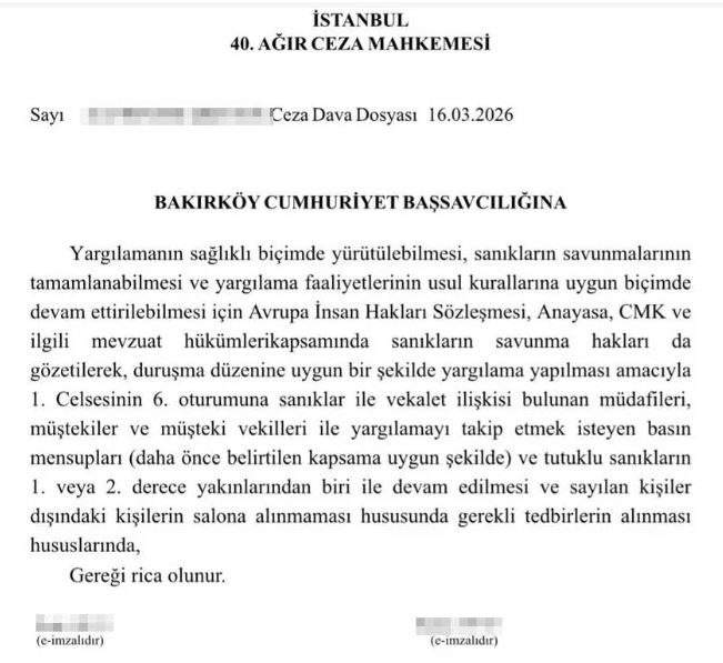 40. Ağır Ceza Mahkemesi'nin talebine olumlu yanıt gelmesi halinde, salona sadece sanık avukatları ve sanıkların 1. veya 2. derece yakınlarından sadece biri girebilecek, davayı takip eden barolar, avukatlar, vekiller ve hatta CHP Genel Başkanı Özgür Özel bile salona alınmayacak.