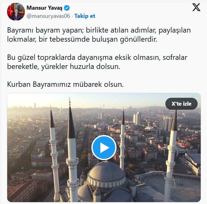 Ankara Büyükşehir Belediye (ABB) Başkanı Mansur Yavaş, sosyal medya platformu X üzerinden Kurban Bayramı dolayısıyla bir mesaj paylaştı.