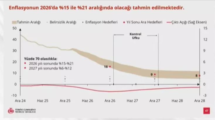 Karahan enflasyon tahminine ilişkin "2026 yılında enflasyonun yüzde 15 ile yüzde 21 aralığında olacağını tahmin ediyoruz. 2027 sonu için ise tahminlerimiz enflasyonun yüzde 6 ile 12 aralığına gerileyeceğini işaret ediyor. Enflasyon hedefimizi ise 2026 ve 2027 yılları için sırasıyla yüzde 16 ve yüzde 9 olarak koruduk. 2028 yılı için ise ara hedefimizi yüzde 8 olarak belirledik. Enflasyonun 2028 yılında yüzde 8'e geriledikten sonra orta vadede yüzde 5 seviyesinde istikrar kazanması öngörüyoruz. 2026 yılı tahmin aralığının güncellenmesinde belli başlı risklerin belirginleşmesi ve varsayım revizyonlarının yanı sıra TÜFE hesaplama yönteminde hizmet grubunun sepet içindeki payının artması da rol oynadı." dedi.