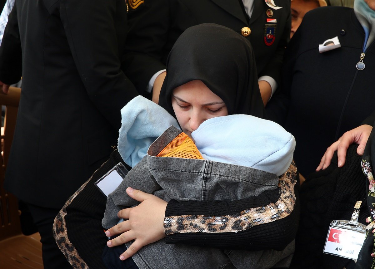 Törene 6 aylık bebeği Yağız Asaf ile katılan şehidin eşi Edanur ve şehidin annesi Fatma Bozlağan tabuta sarılarak ağladı.