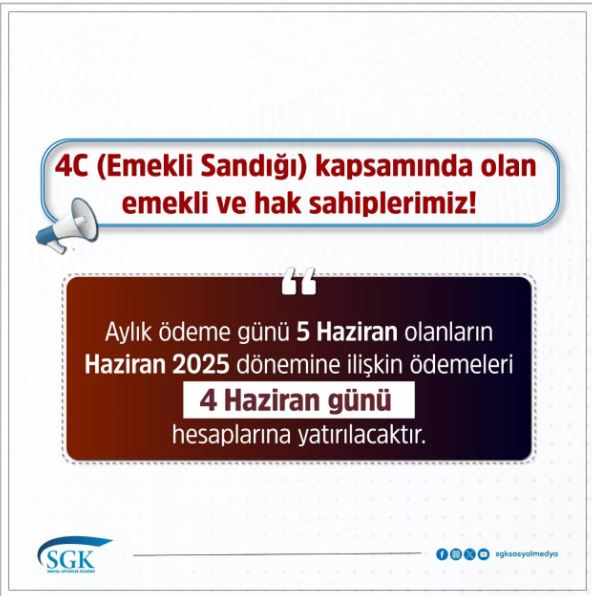 Kurumun sosyal medya hesabından yapılan açıklamada, "Aylık ödeme günü 5 Haziran olan 4C (Emekli Sandığı) kapsamındaki emekli ve hak sahiplerimizin Haziran 2025 dönemine ilişkin aylık ödemeleri öne çekilerek 4 Haziran 2025 tarihinde hesaplara yatırılacaktır." ifadesi kullanıldı.