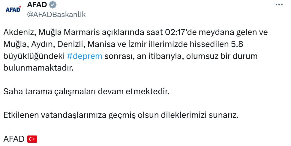 AFAD'dan yapılan açıklamada, "Akdeniz, Muğla Marmaris açıklarında saat 02:17'de meydana gelen ve Muğla, Aydın, Denizli, Manisa ve İzmir illerimizde hissedilen 5.8 büyüklüğündeki deprem sonrası, an itibarıyla, olumsuz bir durum bulunmamaktadır.