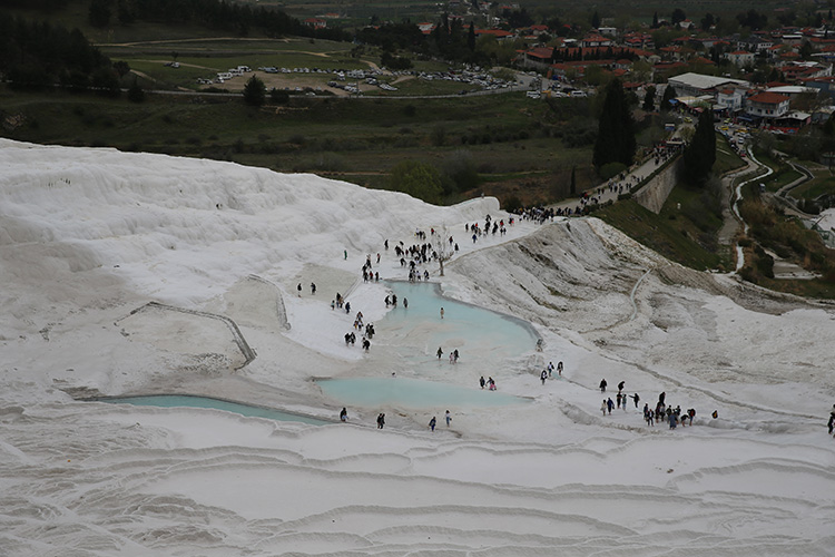 Çoğunluğu yerli misafirler, beyaz travertenler üzerinde yürüyüp hatıra fotoğrafı çekti. Ören yerindeki antik kenti de gezen tatilciler, zaman zaman etkili olan yağışa rağmen giriş kapılarında kuyruk oluşturdu.