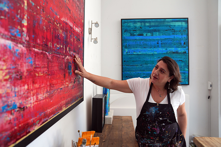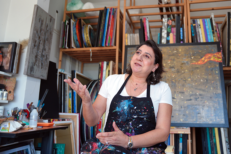 Yasemen Latife Ayvaz, eserlerinde fırça yerine spatula ve akrilik boya ile 22 ayar altın kullandığını dile getirerek, şunları kaydetti: