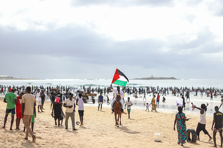 Ritüel kapsamında kumsalda dans eden ve yerel dillerden Volofça ağıtlar yakan Gueye, elindeki Filistin bayrağıyla ata binerek sahili turladı.