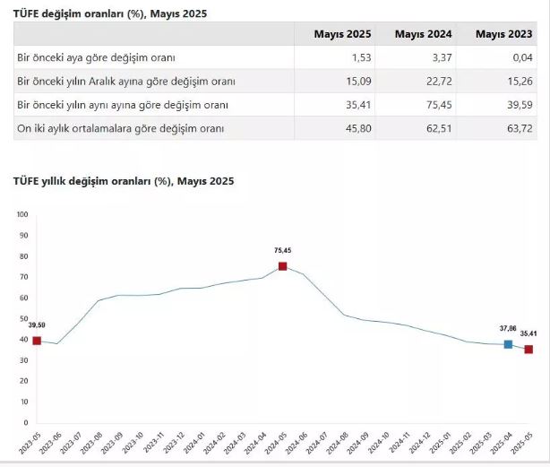 Buna göre, TÜFE'deki değişim Mayıs ayında bir önceki aya göre yüzde 1,53 artış, bir önceki yılın aralık ayına göre yüzde 15,09 artış, bir önceki yılın aynı ayına göre yüzde 35,41 artış ve on iki aylık ortalamalara göre yüzde 45,80 artış olarak gerçekleşti.