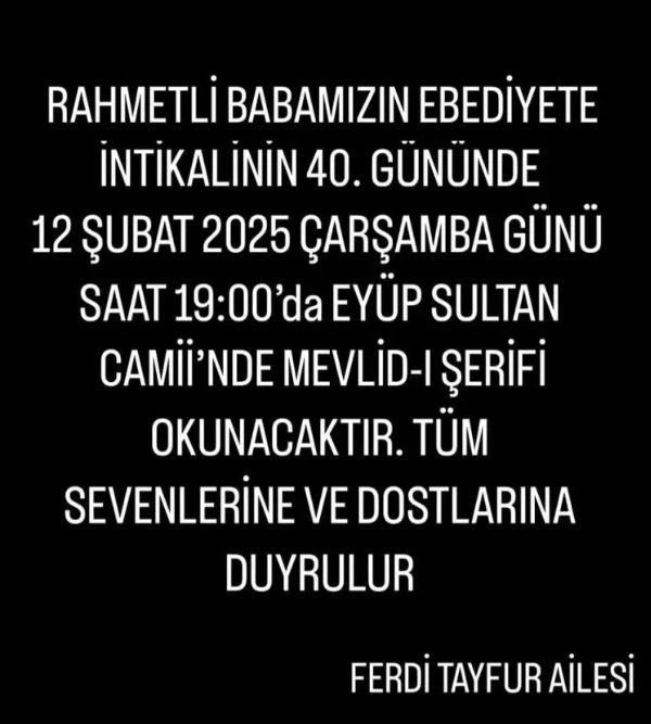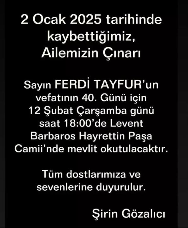 Ferdi Tayfur’un yeğeni Şirin Gözalıcı, sosyal medya hesabından yaptığı açıklamada, 12 Şubat Çarşamba günü saat 18:00'de Levent Barbaros Hayrettin Paşa Camii’nde mevlit okutulacağını duyurdu.