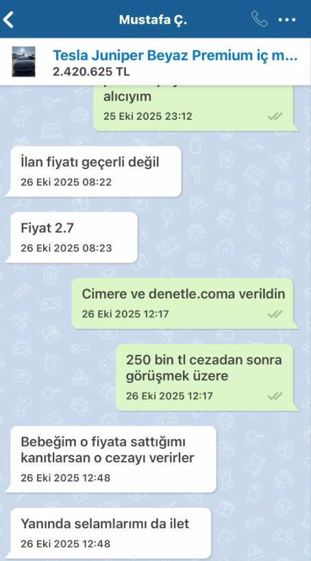 Mustafa Ç., internette 2 milyon 420 bin liraya satışa çıkardığı Tesla aracını satın almak için kendisiyle iletişime geçen alıcıya ilan fiyatının geçerli olmadığını ve aracın fiyatının 2 milyon 700 bin TL olduğunu söyledi.