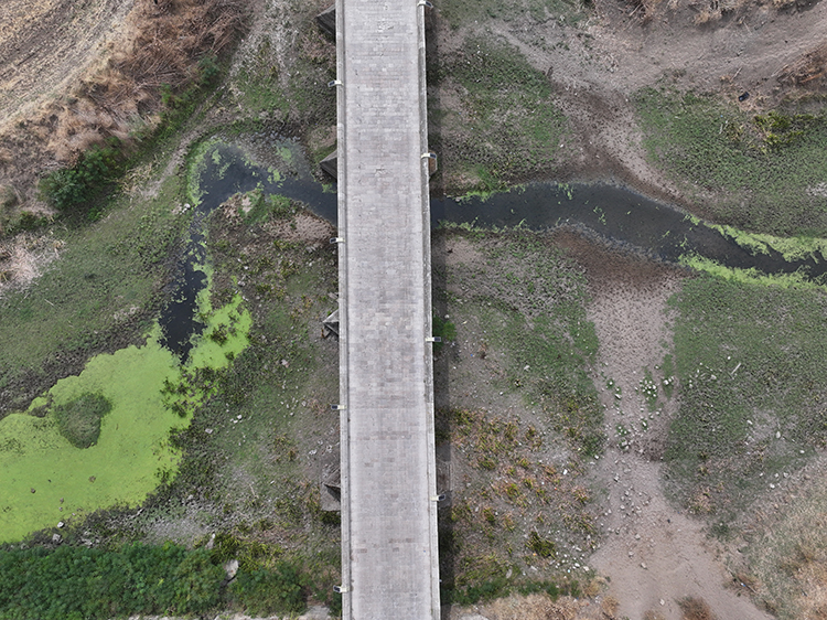 Nehir yatağının su kalan bölümleri yosun ve otlarla kaplandı.