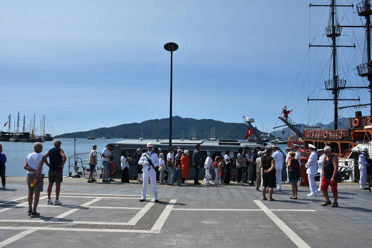 Marmaris’te TCG Gökçeada fırkateyni körfezde alargada bekledi. Atatürk Meydanı'ndan tekneyle vatandaşlar firkateyne götürüldü. Vatandaşlar askeri gemiyi mihmandarlar eşliğinde gezip geminin kabiliyetleri hakkında bilgi edindi.