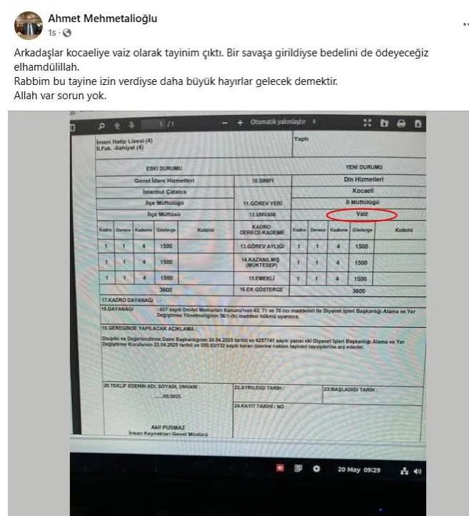 "Arkadaşlar Kocaeli'ye vaiz olarak tayinim çıktı. Bir savaşa girildiyse bedelini de ödeyeceğiz elhamdülillah. Rabbim bu tayine izin verdiyse daha büyük hayırlar gelecek demektir. Allah var sorun yok."