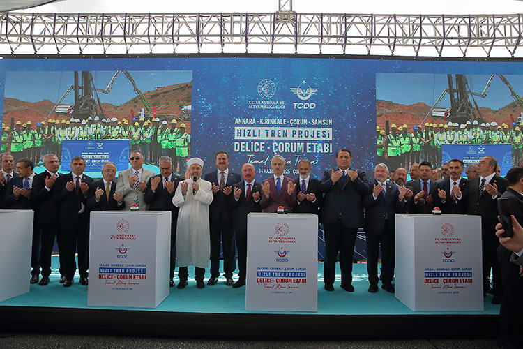 "Devamına Delice'den başlayarak Çorum, Merzifon'u da geçip Samsun'a ulaşacak 293 kilometrelik yeni hızlı tren hattının 120 kilometrelik Delice-Çorum kesimini hayata geçiriyoruz. 200 kilometre hıza uygun şekilde planlanan hattımız tamamlandığında Ankara-Kırıkkale-Çorum arasında kesintisiz hızlı tren bağlantısı sağlanacak ve Çorum-Ankara arası 1 saat 15 dakika olacak. Hattın devamındaki 173 kilometrelik Çorum-Merzifon-Samsun kesimlerinin de tamamlanmasıyla Ankara-Samsun arası seyahat süresi 2,5 saat olacak. Yılda 12 milyon yolcu ve 14 milyon ton yük taşınarak Karadeniz'in dalgalarını Akdeniz'in limanlarına ulaştıracak. Samsun Limanı ile Mersin Limanı'nı birleştiren bu demir yolu koridoru, İstanbul ve Çanakkale boğazları üzerindeki yük trafiğini hafifletecek, Türkiye'yi küresel ticarette lojistik süper güç haline getirecek."