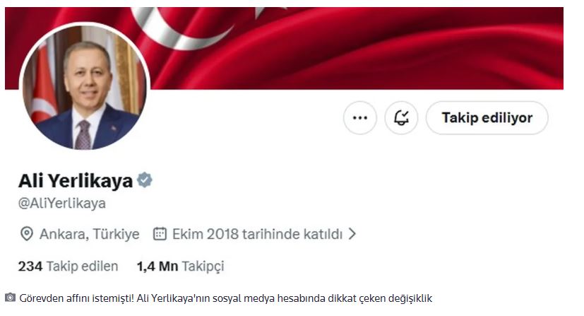 Ancak Yerlikaya'nın sosyal medya hesabından kısa sürede dikkat çeken bir değişiklik yapıldı. Gece yarısı hesap profilinde halen yazılı olan 'İçişleri Bakanı' yazısının, sabahın erken saatlerinde kaldırıldığı görüldü. Tunç'un sosyal medya profilindeki 'Adalet Bakanı' yazısı ise henüz duruyor.